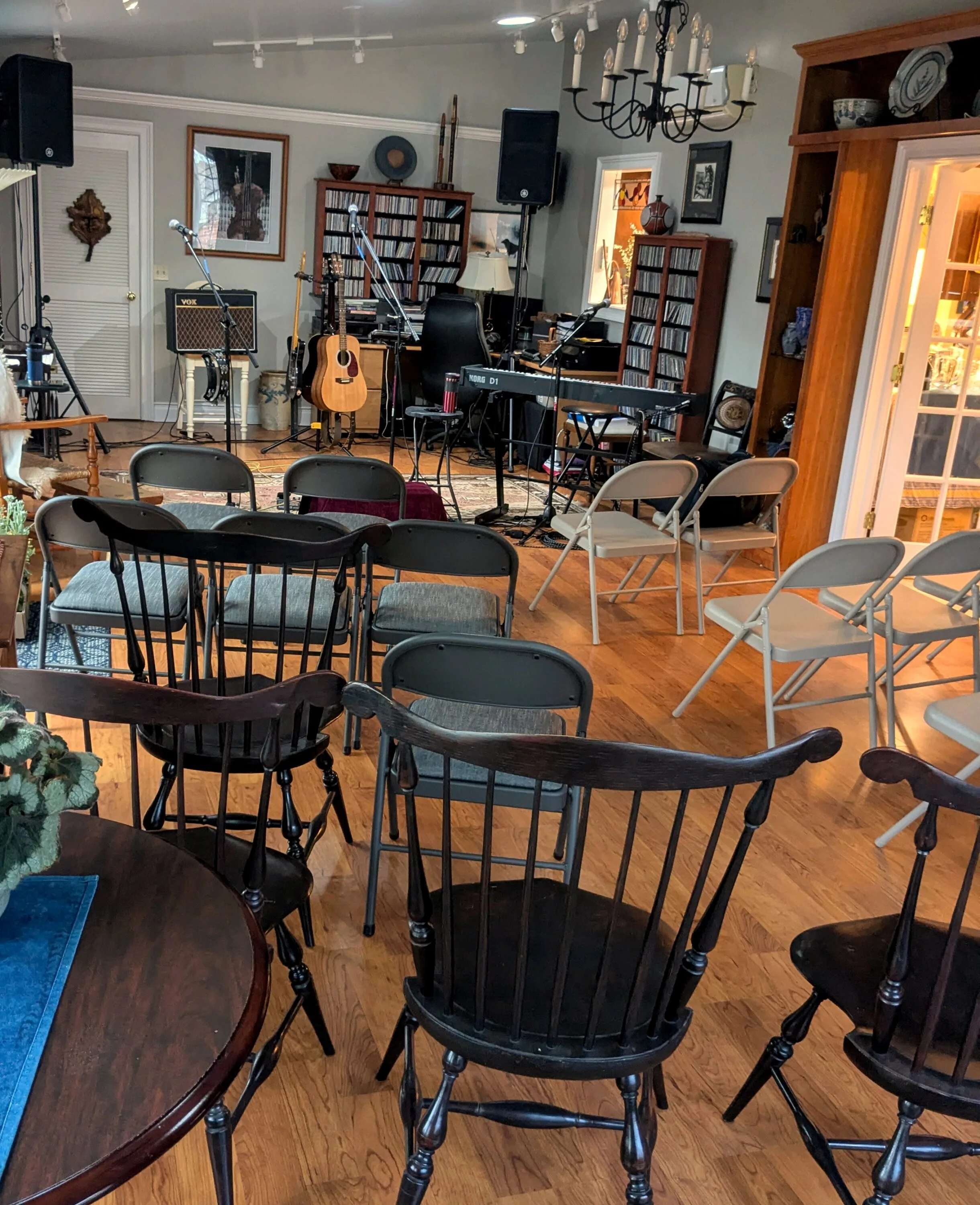 Our house concert in Bridgewater, Virginia, began with a last-minute scramble to set up additional chairs as folks kept arriving and settling into our host’s art-studded dining room. The audience snugly in place and all through that cool spring evening, darkness crept around us outside but could not encroach on the power of music to create connections in that special setting.